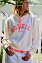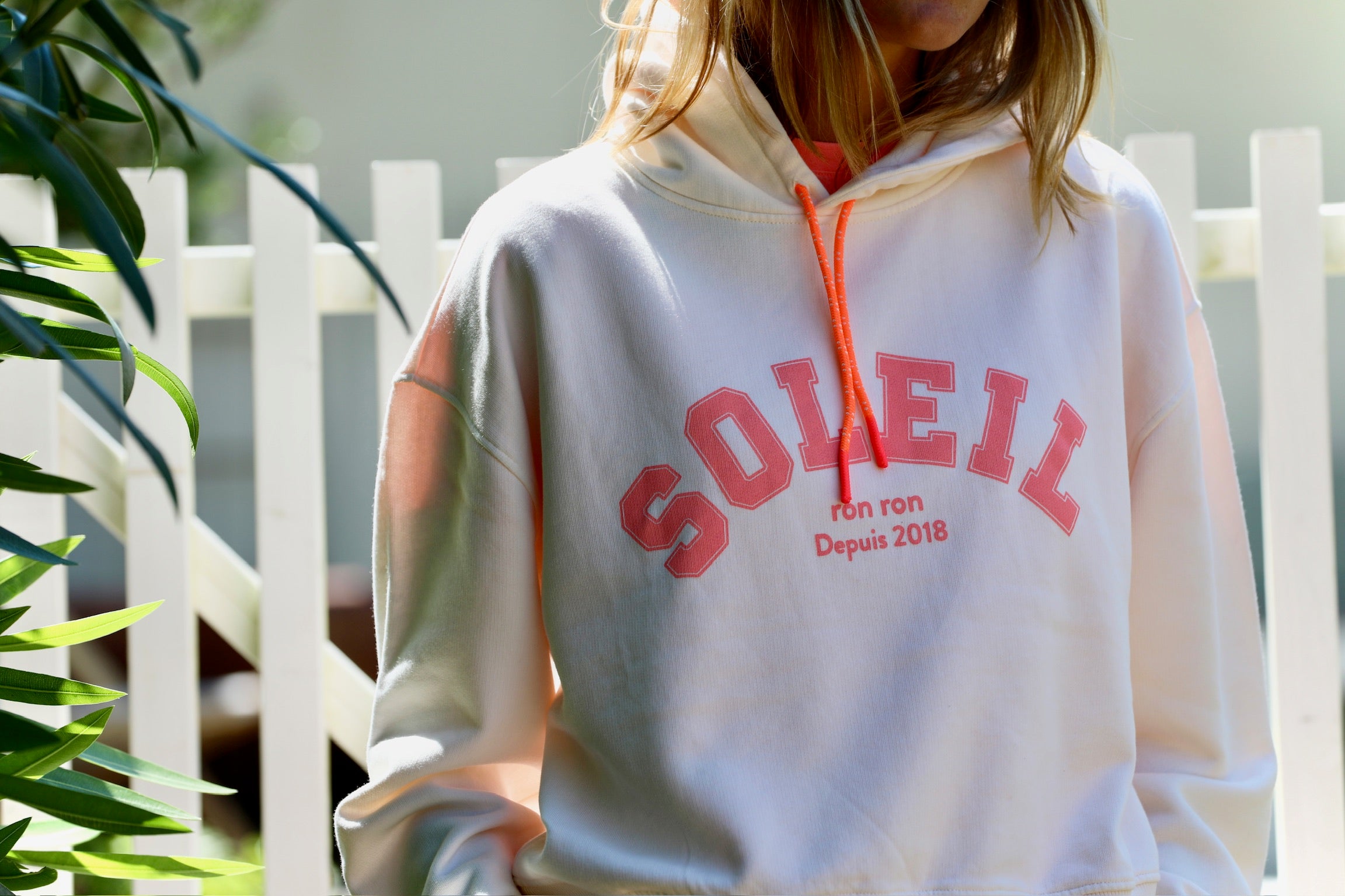 Notre hoodie écru avec son impression Soleil iconique en version fluo !